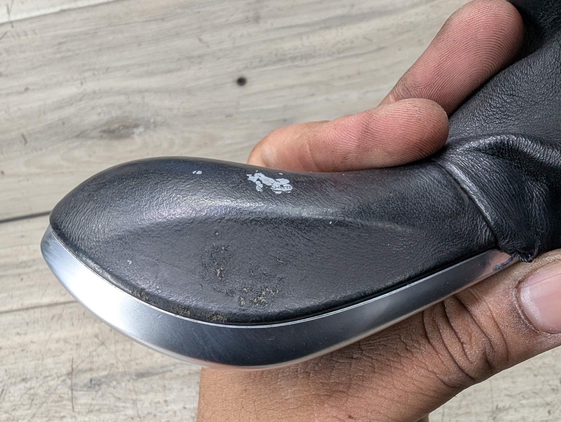 *Bottom leather has ripped stitching/seams! *The leather grip handle has wear! *R-N-D M/S+ sticker adhesive showing through clear sticker!