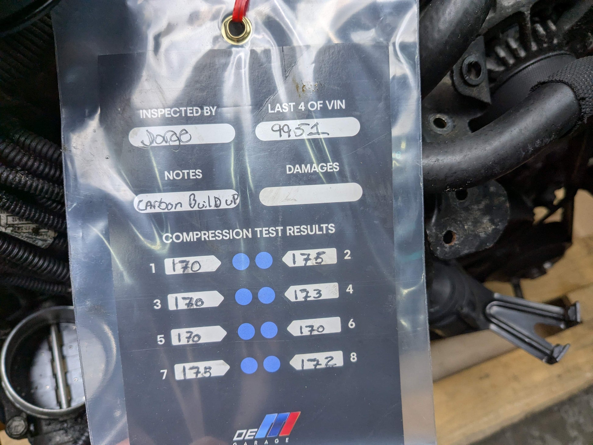 Notes: Engine ran! Video available, had a misfire but we used horoscope to check engine and everything looked fine other than some carbon buildup. Seemed like a bad coil/injector caused misfire. Compression results were excellent as well.